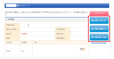 【3】予約内容確認ページ内「お問い合わせ」等のボタンよりご連絡をお願いいたします。